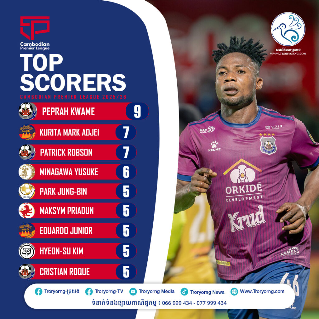 ព្រះខ័នរាជស្វាយរៀង ឈរកំពូលតារាង ដាច់ ៣ពិន្ទុពី អង្គរថាយហ្គឺរ និងភ្នំពេញក្រោន នៃពានរង្វាន់លីគកំពូលកម្ពុជា (Cambodian Premier League) រដូវកាលឆ្នាំ២០២៥-២៦ ក្រោយបញ្ចប់សប្ដាហ៍ទី១១ កាលពីថ្ងៃទី១៩ វិច្ឆិកា ២០២៥។
