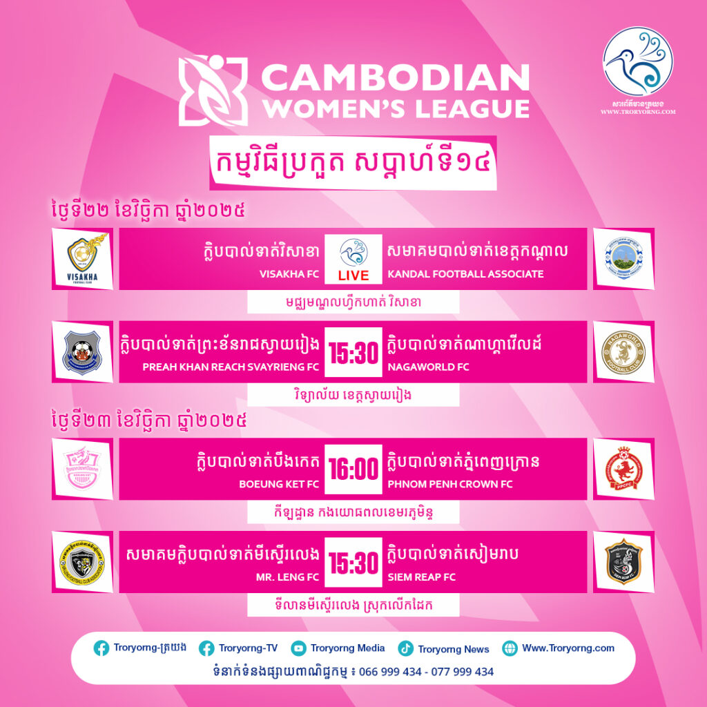 នៅរសៀលថ្ងៃទី២២ ខែវិច្ឆិកា ឆ្នាំ២០២៥ នេះ ក្រុមម្ចាស់ផ្ទះវិសាខា នឹងត្រៀមប៉ះក្រុមខេត្តកណ្តាល សម្រាប់ជំនួបចុងក្រោយសប្តាហ៍ទី១៤ នៃពានរង្វាន់លីគនារីកម្ពុជា Cambodian Women’s league 2025-26 ខណៈការប្រកួតនេះនឹងផ្សាយផ្ទាល់ដោយសារព័ត៌មានត្រយង ។