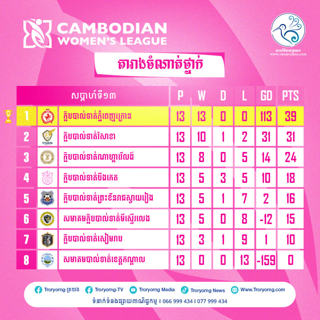សម្រាប់ផ្ទះនារីវិសាខា គិតត្រឹមសប្តាហ៍ទី១៣ មកនេះមាន៣១ពិន្ទុក្នុងដៃ ដោយ១៣ប្រកួតកន្លងទៅ ឈ្នះ១០ និងចាញ់២។
