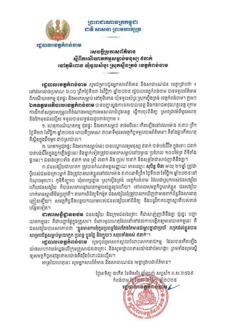 កំពង់ចាម÷ នៅព្រឹកម៉ោងប្រហែល ៥:០០នាទី ថ្ងៃទី២៣ ខែវិច្ឆិកា ឆ្នាំ២០២៥ ស្ថិតនៅភូមិពោន ឃុំទួលសំបួរ ស្រុកស្ទឹងត្រង់ ខេត្តកំពង់ចាម បានកើតមានករណីឃាតកម្មសាហាវ មួយ បណ្ដាលឲ្យស្លាប់មនុស្សសរុប០៩នាក់ ក្នុងនោះមានសមាជិកគ្រួសារ និងសាច់ញាតិជាច្រើននាក់។