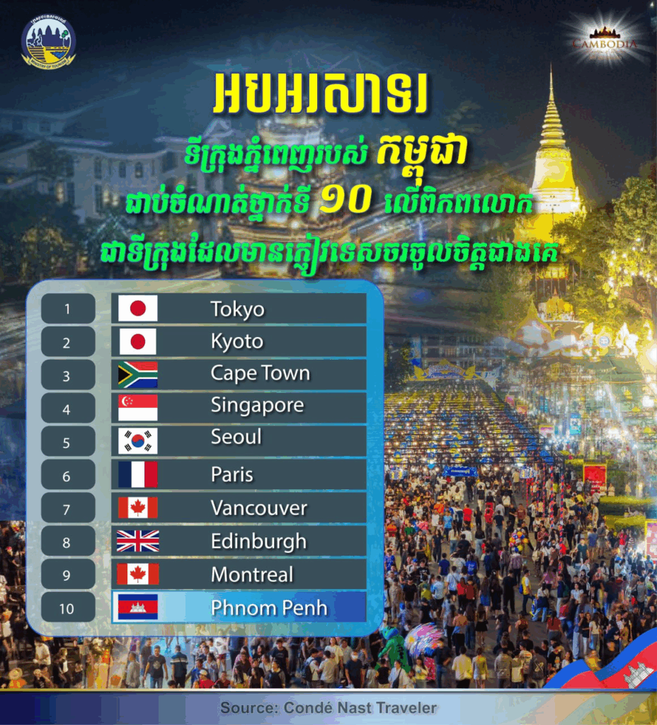 តាមក្រសួងទេសចរណ៍បានដកស្រង់ការផ្សាយរបស់គេហទំព័រ cntraveler នាពេលថ្មីៗនេះឱ្យដឹងថា រាជធានីភ្នំពេញ ដែលជាបេះដូងនៃប្រទេសកម្ពុជាកំពុងស្ថិតនៅក្នុងលំដាប់ទី ១០ លើពិភពលោក ដែលមានមន្តស្នេហ៍ជាទីក្រុងមានភ្ញៀវទេសចរចូលចិត្តមកកម្សាន្តជាងគេ។