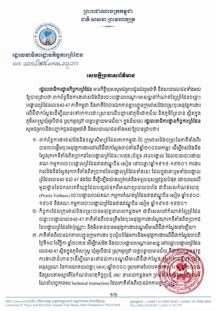 រដ្ឋលេខាធិការដ្ឋាន ក៏បានអំពាវនាវដល់សាធារណជន ឲ្យជឿទុកចិត្តលើការងាររបស់រដ្ឋាភិបាល និងគណៈកម្មការ JBC ដែលបន្តអនុវត្តភារកិច្ចដោយវិជ្ជាជីវៈ និងការទទួលខុសត្រូវខ្ពស់ ដោយគោរពច្បាប់អន្តរជាតិ និងការការពារអធិបតេយ្យជាតិ៕