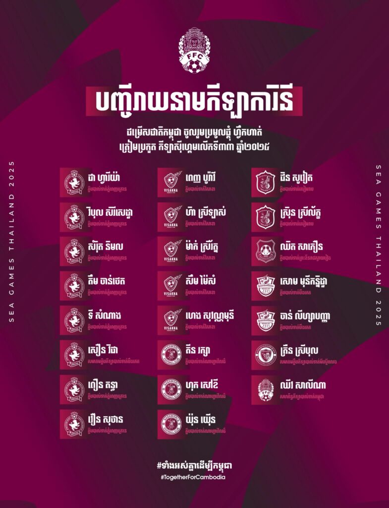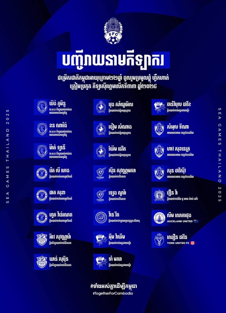 នៅថ្ងៃទី២៤ ខែវិច្ឆិកា សហព័ន្ធកីឡាបាល់ទាត់កម្ពុជា បានបញ្ចេញបញ្ជីរាយនាមកីឡាករក្រុមជម្រើសជាតិកម្ពុជា អាយុក្រោម២២ឆ្នាំ ត្រៀមសម្រាប់ការប្រកួតកីឡាសុីហ្គេម លើកទី៣៣ ឆ្នាំ២០២៥ នៅប្រទេសថៃ។
