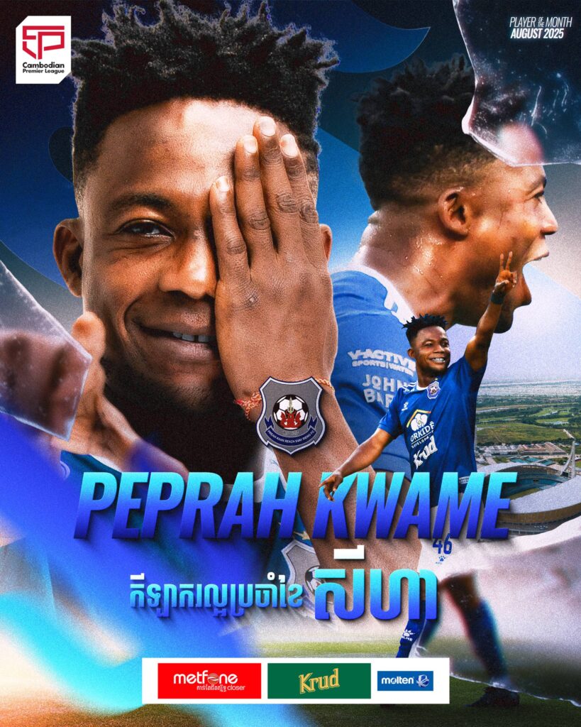ទី១) កីឡាករ KWAME PEPRAH ខ្សែប្រយុទ្ធរបស់ក្លិបព្រះខ័នរាជស្វាយ ឈ្នះពានកីឡាករល្អប្រចាំខែសីហា
