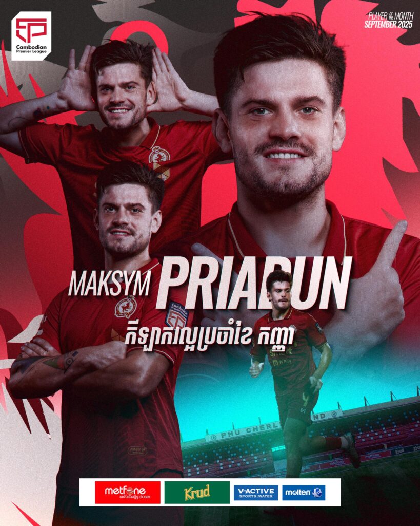ទី២) កីឡាករ Maksym Priadum ខ្សែប្រយុទ្ធរបស់ក្លិបភ្នំពេញក្រោន ឈ្នះពានកីឡាករល្អប្រចាំខែកញ្ញា