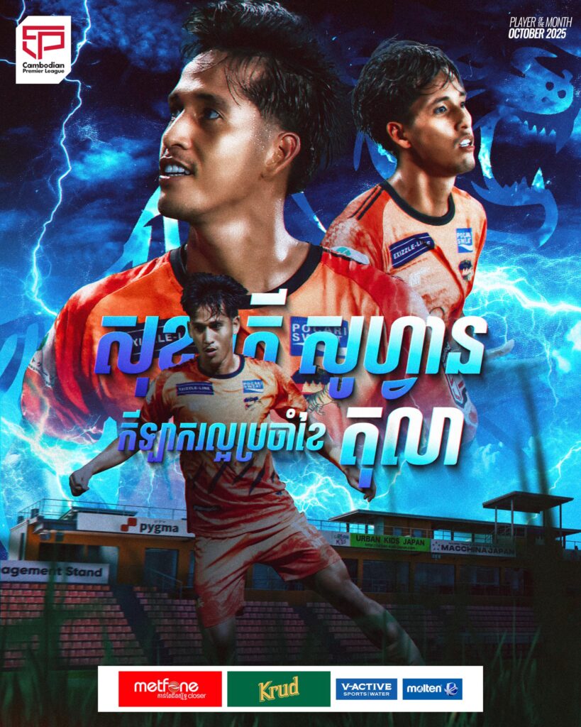 ទី៣) កីឡាករ សុខ គ្រី សូហ្វាន ខ្សែបម្រើប្រយុទ្ធរបស់ក្លិបបាល់ទាត់អង្គរ ឈ្នះពានកីឡាករល្អប្រចាំខែតុលា