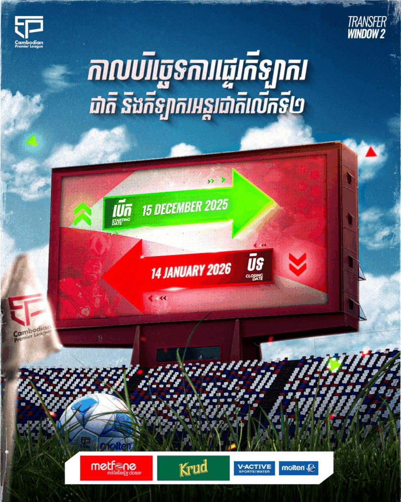 ទីផ្សារដោះដូរកីឡាករជុំទី២ នៃជម្រើសជើងឯកពានរង្វាន់លីគកំពូលកម្ពុជា (Cambodian Premier League) រដូវកាលឆ្នាំ២០២៥-២៦ នឹងចាប់ផ្តើមពីថ្ងៃទី១៥ ខែធ្នូ ឆ្នាំ២០២៥ ដល់ថ្ងៃទី១៥ ខែមករា ឆ្នាំ២០២៦ សម្រាប់ក្លិបដែលជាសមាជិក ចង់ផ្ទេរកីឡាករជាតិ និងអន្តរជាតិ នេះបើយោងតាមការបញ្ជាក់របស់ CPL។