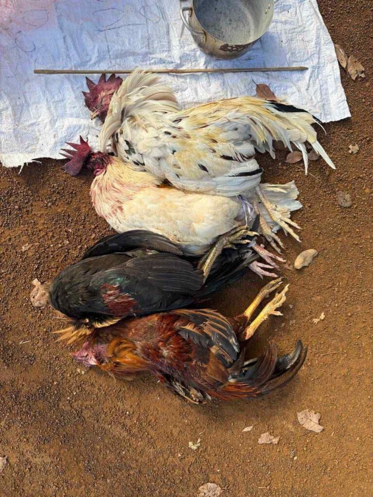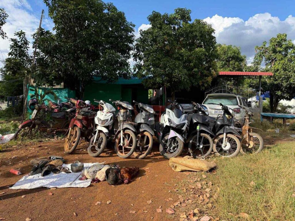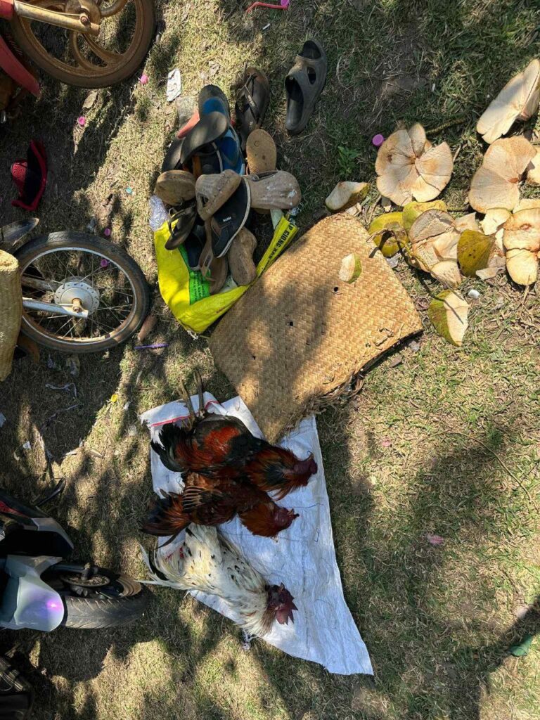 ក្នុងនោះវត្ថុតាងដែលដកហូតបានរួមមាន៖ ម៉ូតូចំនួន ០៧ គ្រឿង, រថយន្តចំនួន ០១ គ្រឿង, មាន់ជល់ចំនួន ០៤, ក្បាល (ងាប់), ស្គុតចំនួន ០១ ដុំធំ, ស្បែកជើងចំនួន ០៦ គូ។