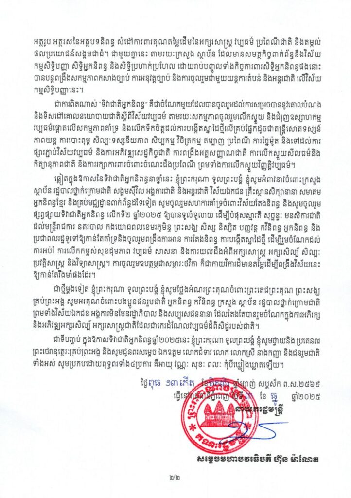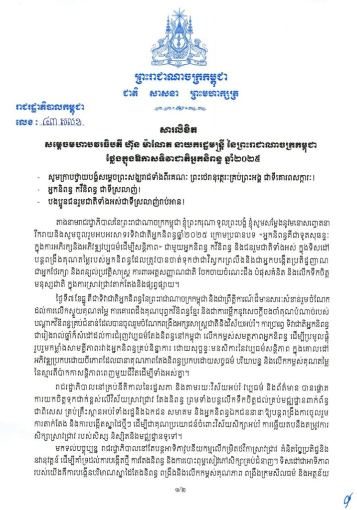 សារលិខិតរបស់សម្តេចធិបតី ហ៊ុន ម៉ាណែត ក្នុងទិវាជាតិអ្នកនិពន្ធឆ្នាំ២០២៥ ក្រោមប្រធានបទ «អ្នកនិពន្ធគឺជាទូតសុឆន្ទៈ ក្នុងការអភិរក្សនិងអភិវឌ្ឍវប្បធម៌ដើម្បីសន្តិភាព» បានលើកឡើងអំពីគុណតម្លៃរបស់អ្នកនិពន្ធ ដែលត្រូវបានចាត់ទុកថាជា៖