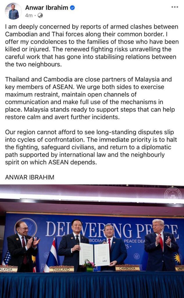 នៅឯ កូឡាឡាំពួ លោក អាន់វ៉ា អ៊ីប្រាហ៊ីម នាយករដ្ឋមន្ត្រីម៉ាឡេស៊ី និងជាប្រធានប្ដូរវេនអាស៊ាន ដែលបាន សហការ រៀបចំឲ្យមាន កិច្ចព្រមព្រៀង បទឈប់បាញ់ និងសេចក្តីថ្លែងការណ៍រួមស្តីពីកិច្ចព្រមព្រៀងសន្តិភាពរវាងកម្ពុជានិងថៃ បានសម្តែងការព្រួយបារម្ភយ៉ាងខ្លាំងចំពោះរបាយការណ៍នៃការប៉ះទង្គិចគ្នាដោយអាវុធសាជាថ្មីរវាងកងកម្លាំងកម្ពុជា និងថៃតាមបណ្តោយព្រំដែន។ ជាមួយនឹងសារចូលរួមរំលែកទុក្ខដល់ក្រុមគ្រួសាររងគ្រោះដោយ ជម្លោះ នេះ លោក អាន់វ៉ា បានលើកឡើងទំនងជា ខកចិត្ត ចំពោះការខិតខំប្រឹងប្រែងយ៉ាងសកម្មក្នុងការចូលរួមរក្សាសន្តិភាព និងស្ថេរភាពនៅតាមព្រំដែននៃប្រទេសទាំងពីរ៕