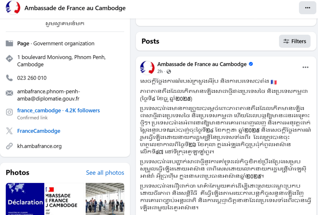 ប្រទេសបារំាងបញ្ជាក់សាជាថ្មីនូវការគាំទ្រដល់កិច្ចខិតខំប្រឹងប្រែងសម្របសម្រួលធ្វើឡើងដោយអាស៊ាន ជាពិសេសដោយលោកនាយករដ្ឋមន្រ្តីម៉ាឡេស៊ី អាន់វ៉ា អ៊ីប្រាហ៊ីម ក្នុងនាមជាប្រធានអាស៊ានឆ្នាំ២០២៥។