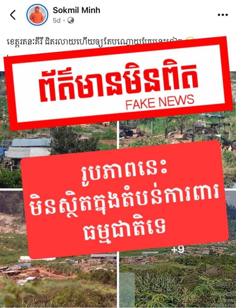 មន្រ្តីជំនាញនៃមន្ទីរបរិស្ថានខេត្តរតនគីរី បានធ្វើការផ្ទៀងផ្ទាត់ព័ត៌មានភូមិសាស្រ្ត (តាមផែនទី) និងបានចុះទៅត្រួតពិនិត្យអង្កេតលើទីតាំផ្ទាល់ បន្ទាប់ពីមានសេចក្តីរាយការណ៍របស់ផេកហ្វេប៊ុកឈ្មោះ Sokmil Minh កាលពីពេលថ្មីៗកន្លងមកនេះ ថាមានករណីកាប់ឈើនៅតំបន់ការពារធម្មជាតិ ក្នុងភូមិសាស្រ្តខេត្តរតនគិរី ជារឿងមិនពិត។