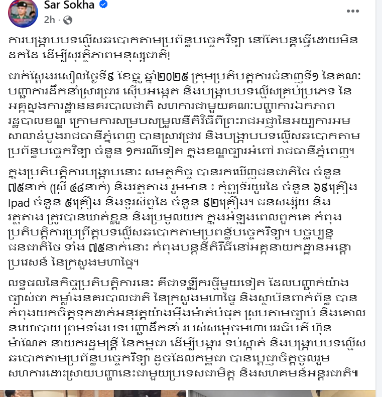 នេះបើយោងតាមការបញ្ជាក់របស់ឯកឧត្តមអភិសន្តិបណ្ឌិត ស សុខា ឧបនាយករដ្ឋមន្ត្រី រដ្ឋមន្ត្រីមហាផ្ទៃតាមរយៈទំព័រហ្វេសប៊ុកផ្លូវការរបស់ឯកឧត្តមនៅរសៀលថ្ងៃទី១០ធ្នូ ឆ្នាំ២០២៥នេះ។