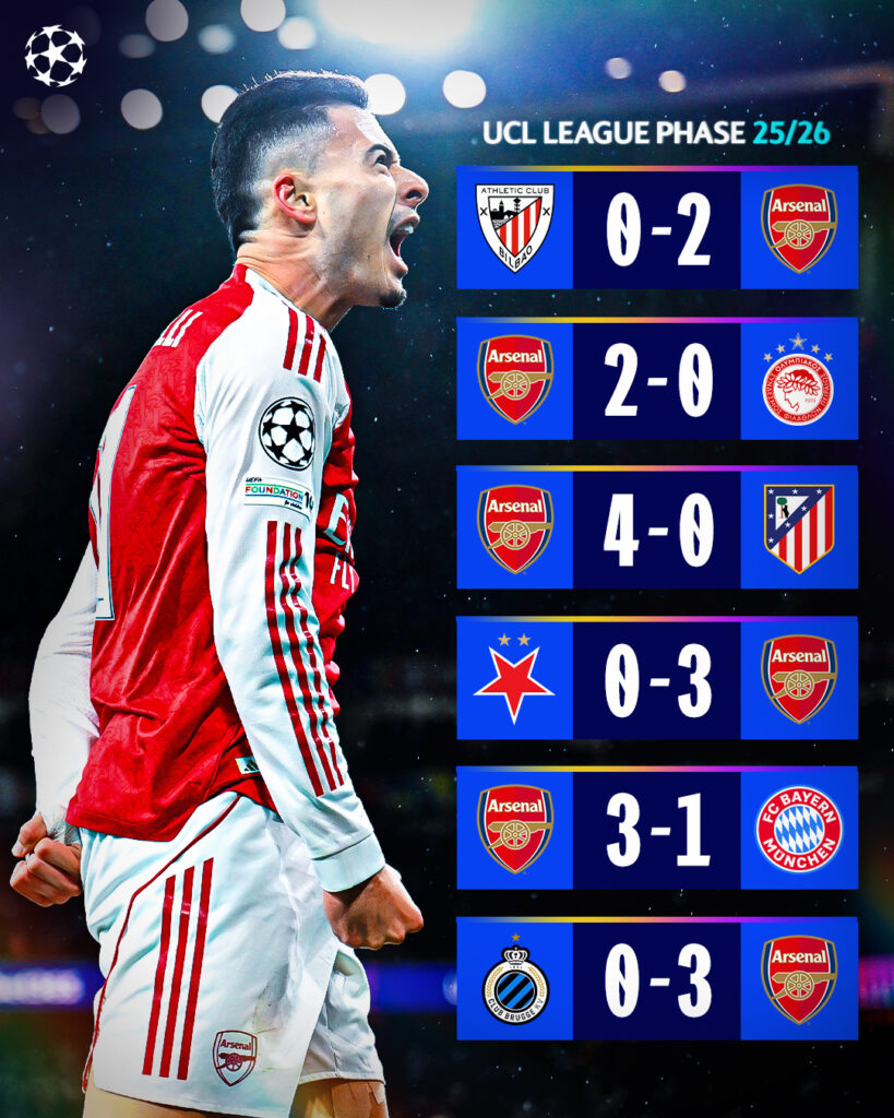 ការប្រកួតជុំទី៦ វគ្គសន្សំពិន្ទុ League Phase ពានរង្វាន់លំដាប់ទី១ ប្រចាំទ្វីបអឺរ៉ុប UEFA Champions League 2025-26 ស្រពេលមានក្រុមតែ១គត់គឺ Arsenal ប្រកួតមិនទាន់បរាជ័យសោះ ៦ប្រកួតឈ្នះទាំង៦ មាន១៨ពិន្ទុពេញ។