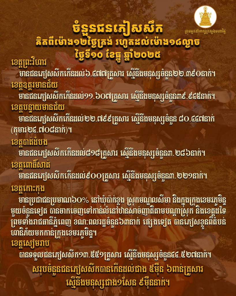 សកម្មភាពឈ្លានពានដោយប្រដាប់អាវុធរបស់ថៃ បានបង្កឱ្យមានការខូចខាតយ៉ាងធ្ងន់ធ្ងរ ដោយគិតត្រឹមថ្ងៃទី១០ ខែធ្នូ ឆ្នាំ២០២៥នេះ មានពលរដ្ឋខ្មែរ ៣៧១១៥គ្រួសារ គិតជាចំនួនមនុស្សស្មើនឹង១២៧១៣៣នាក់ ត្រូវបានអាជ្ញាធរជម្លៀស និងរៀបចំឱ្យស្នាក់នៅជំរំភៀសសឹក ហើយក៏បានធ្វើឱ្យជនស៊ីវិលស្លូតត្រង់បាត់បង់ជីវិតកើនឡើងរហូតដល់ចំនួន ១០នាក់ (ទារក ១នាក់) និងរងរបួសជនស្លូតត្រង់ចំនួន ៦០ នាក់។