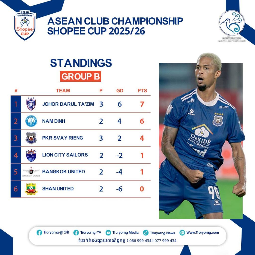 - ថ្ងៃទី៤ ធ្នូ ២០២៥៖ ព្រះខ័នរាជស្វាយរៀង ២-២ Johor Darul Ta’zim FC