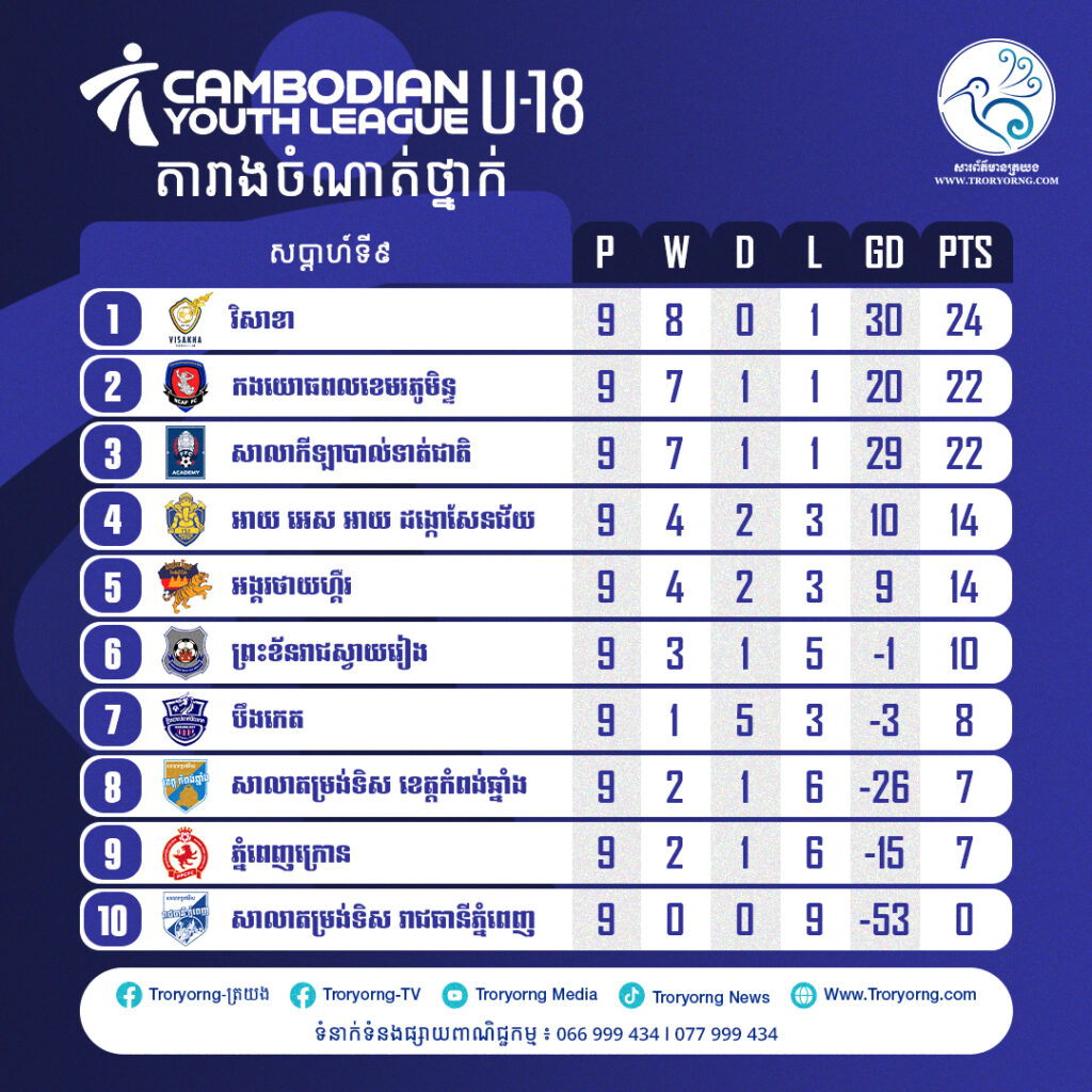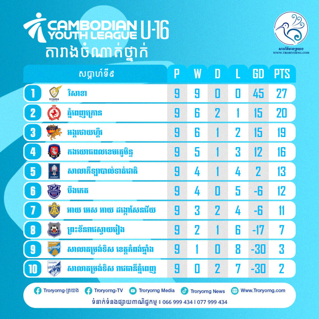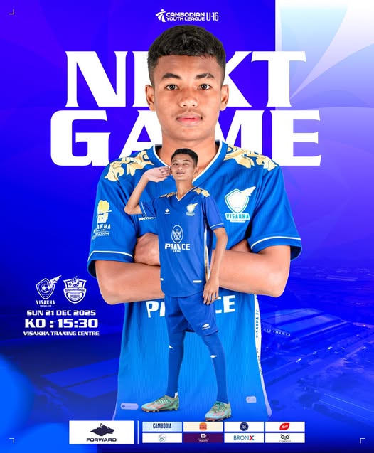 ក្រុមបាល់ទាត់យុវជន វិសាខា អាយុក្រោម១៦ឆ្នាំ កំពុងឈរកំពូលតារាង ក្រោយឆ្លងកាត់ ៩ប្រកួតឈ្នះទាំង ១ប្រកួត ស៊ុតបាន ៤៧គ្រាប់របូតវិញ តែ២គ្រាប់ប៉ុណ្ណោះ នៃពានរង្វាន់លីគយុវជន Cambodian Youth League ឆ្នាំ២០២៥-២៦ ក្រោយឈ្នះ U16 កងយោធពលខេមរភូមិន្ទ សប្ដាហ៍ទី៩ ថ្ងៃទី១៤ ធ្នូ ២០២៥។