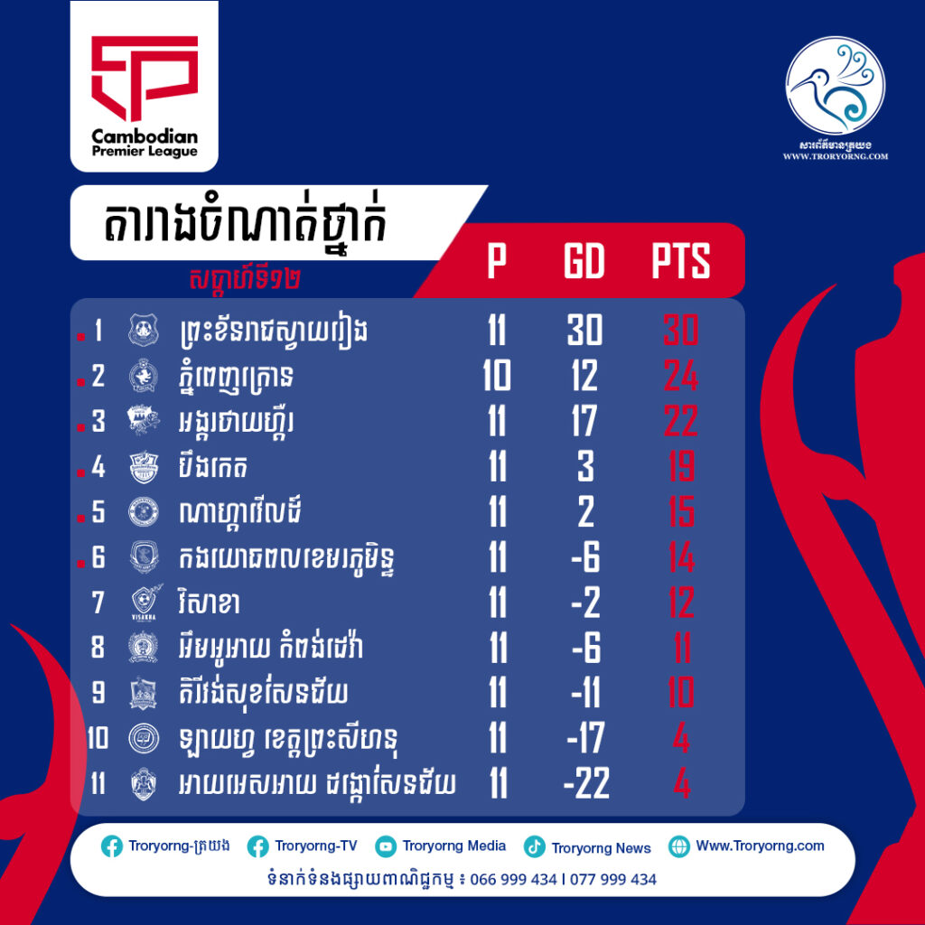 ដូច្នេះ សម្រាប់តារាងចំណាត់ថ្នាក់បច្ចុប្បន្ន ក្លិបព្រះខ័នរាជស្វាយរៀង លេងចំនួន ១១ ប្រកួត ឈ្នះ ១០ ចាញ់ ១ មាន ៣០ពិន្ទុ៕