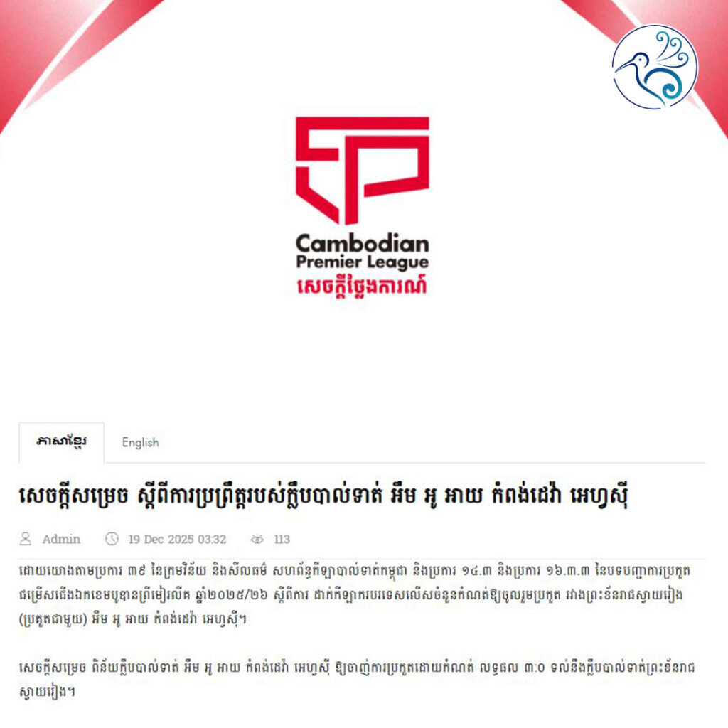 នៅព្រឹកថ្ងៃទី១៩ ធ្នូ ក្រុមហ៊ុនលីគកំពូលកម្ពុជា បានចេញសេចក្តីសម្រេច ស្តីពីការប្រព្រឹត្តរបស់ក្លិបបាល់ទាត់ អឹម អូ អាយ កំពង់ដេវ៉ា អេហ្វស៊ី ក្នុងការប្រកួតទល់នឹងព្រះខ័នរាជស្វាយរៀង កាលពីថ្ងៃទី១៤ ធ្នូ កន្លងទៅ។