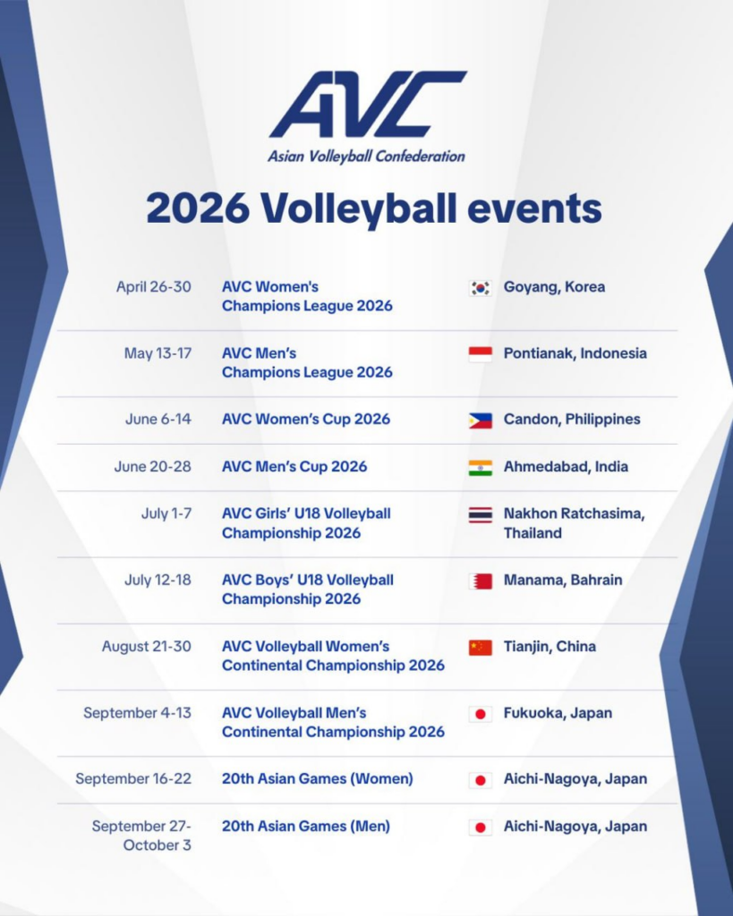 នៅថ្ងៃទី២០ ខែធ្នូ ឆ្នាំ២០២៥នេះ សហព័ន្ធកីឡាបាល់ទះប្រចាំទ្វីបអាស៊ី បានដាក់ចេញនូវកាលវិភាគផ្លូវការនៃការប្រកួតសំខាន់ៗប្រចាំឆ្នាំ២០២៦ ដែលគ្រោងរៀបចំនៅប្រទេសចំនួន៨។
