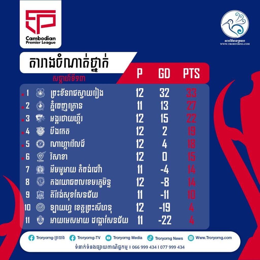 ព្រះខ័នរាជស្វាយរៀង ឈរកំពូលតារាង ក្រុមកំពូលទាំង TOP 4 ដោយនាំមុខក្រុមលេខ២ ភ្នំពេញក្រោន ៦ពិន្ទុ