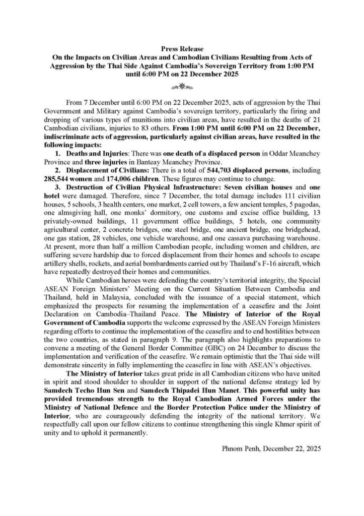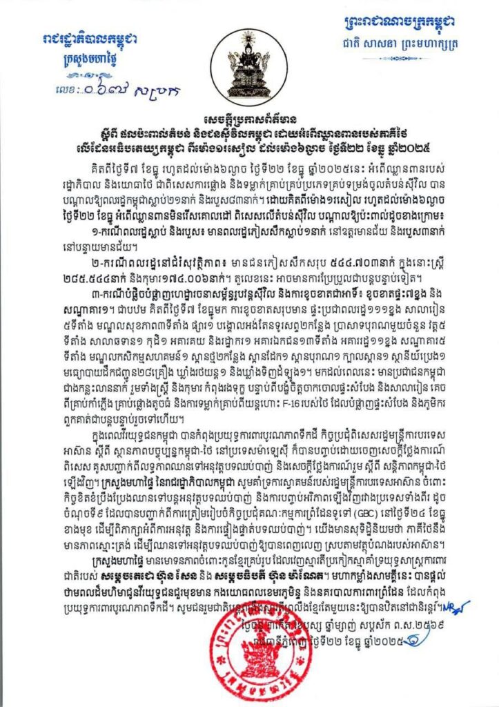 ដោយឡែកបើតាមការបញ្ជាក់របស់ក្រសួងកាពារជាតិស្ដីពីការអំពើឈ្លានពានរបស់ថៃមកលើដែនអធិបតេយ្យកម្ពុជាបានឱ្យដឹង ចាប់ពីល្ងាចថ្ងៃទី២១ ដល់ព្រឹកថ្ងៃទី២៣ ខែធ្នូ ឆ្នាំ២០២៥ កងកម្លាំងយោធាថៃបានបន្តអនុវត្តសកម្មភាពបាញ់ប្រហារ និងប្រើអាវុធធ្ងន់ជាច្រើនប្រភេទ ដើម្បីឈ្លានពានមកលើដែនអធិបតេយ្យរបស់ព្រះរាជាណាចក្រកម្ពុជា នៅ ទិសយោធភូមិភាគទី៤ ក្នុងភូមិសាស្រ្តខេត្តឧត្តរមានជ័យ ខេត្តព្រះវិហារ និងខេត្តសៀមរាប យោធាថៃបានប្រើប្រាស់កាំភ្លើងធំ រថក្រោះ កាំភ្លើងត្បាល់ ដ្រូន និងយន្តហោះចម្បាំង F-16 បាញ់ និងទម្លាក់គ្រាប់បែកចូលក្នុងភូមិសាស្ត្រប្រាសាទតាមាន់ ប្រាសាទព្រះវិហារ និងតំបន់ជាច្រើនផ្សេងទៀត ជ្រៅចូលក្នុងដែនអធិបតេយ្យកម្ពុជា។ ចំណែកនៅទិសយោធភូមិភាគទី៥ ក្នុងភូមិសាស្រ្តខេត្តបន្ទាយមានជ័យ បាត់ដំបង និងពោធិ៍សាត់ យោធាថៃបានបន្តបាញ់កាំភ្លើងធំ បាញ់ភ្លើងក្រហម ប្រើដ្រូន និងយន្តហោះ F-16 វាយប្រហារចូលតំបន់ព្រំដែន និងទីតាំងប្រជាពលរដ្ឋស៊ីវិល បណ្តាលឲ្យមានជនស៊ីវិលរងរបួស និងការខូចខាតលំនៅដ្ឋាន។ ហើយនៅថ្ងៃទី២៣ ខែធ្នូ ឆ្នាំ២០២៥ វេលា ម៉ោង ៨:០១នាទី យោធាថៃបានបាញ់ផ្លោងចំនួន ២គ្រាប់ ក្នុងភូមិសាស្ត្រប៉ោយប៉ែត ១គ្រាប់ធ្លាក់នៅសង្កាត់អូរឬស្សី និង ១គ្រាប់ទៀត ធ្លាក់នៅសង្កាត់និមិត្ត ក្រុងប៉ោយប៉ែត ខេត្តបន្ទាយមានជ័យ។