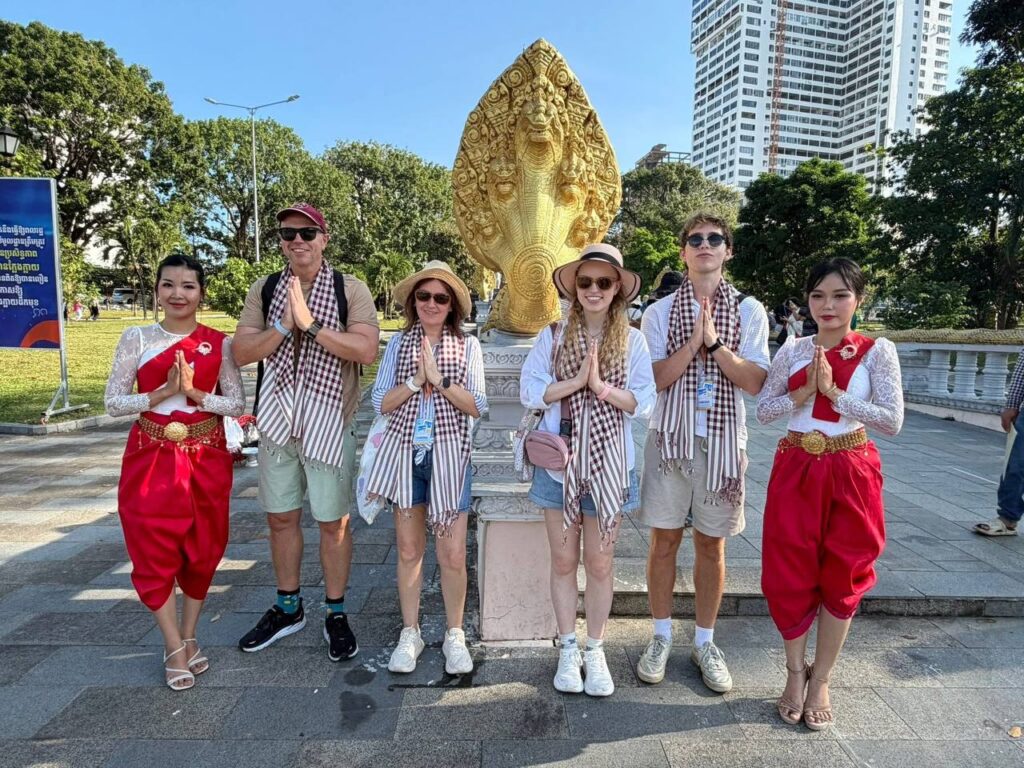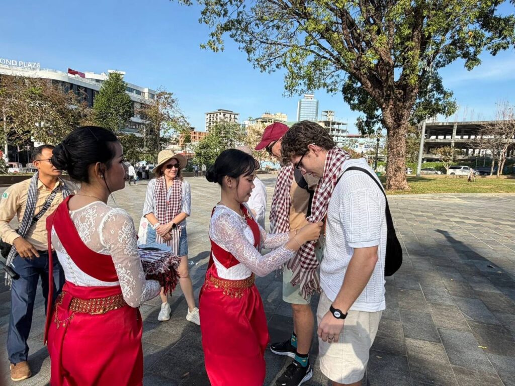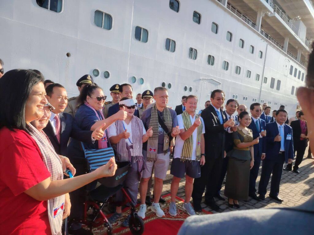 ក្នុងការចូលចតនារបស់នាវាទេសចរណ៍ព្រឹកនេះ ឯកឧត្តម ម៉ាង សុីណេត អភិបាលខេត្តព្រះសីហនុ និង ឯកឧត្តម ហួត ហាក់ រដ្ឋមន្ត្រីក្រសួងទេសចរណ៍ ព្រមទាំងមន្ត្រីមន្ទីរពាក់ព័ន្ធបាន អញ្ជើញទទួលស្វាគមន៍ ភ្ញៀវទេសចរណ៍ ចំរុះជាតិសាសន៍ ដែលមកទស្សនាកម្ពុជា រយៈពេលមួយថ្ងៃ និង មានរៀបចំរបាំជូនពរ និង ជូនក្រម៉ាខ្មែរដល់ភ្ញៀវទេសចរណ៍ម្នាក់មួយទុកជាអនុស្សាវរីយ៍ផងដែរ ។