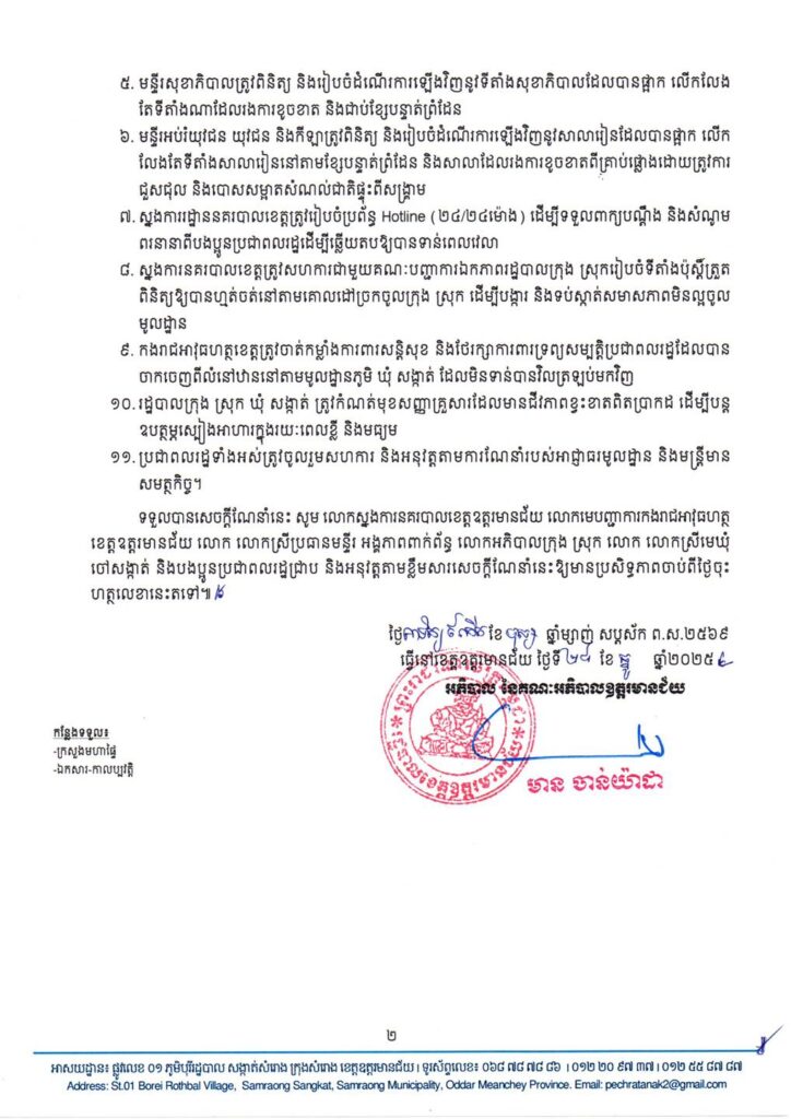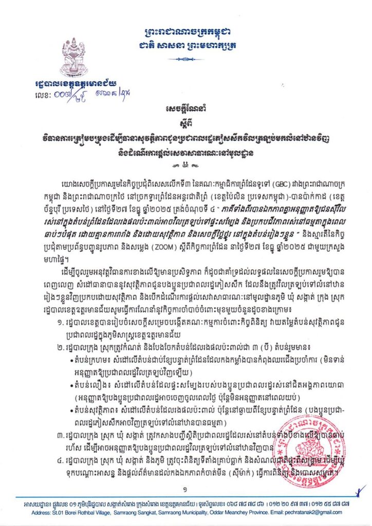ខេត្តឧត្តរមានជ័យ៖ រដ្ឋបាលខេត្តឧត្តរមានជ័យ បានចេញសេចក្តីណែនាំថ្មីមួយ ស្តីពីការត្រៀមលក្ខណៈធានាសុវត្ថិភាពជូនប្រជាពលរដ្ឋដែលត្រូវវិលត្រឡប់មករស់នៅតាមលំនៅឋានដើមវិញ និងការស្តារឡើងវិញនូវសេវាសាធារណៈនៅមូលដ្ឋាន ក្រោយមានការព្រមព្រៀងគ្នារវាងគណៈកម្មាធិការព្រំដែនទូទៅ (GBC) កម្ពុជា-ថៃ កាលពីថ្ងៃទី១៧ ខែធ្នូ ឆ្នាំ២០២៤ កន្លងទៅ។