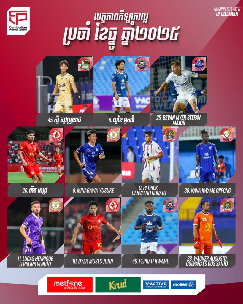 បេក្ខភាពកីឡាករឆ្នើម ១១រូប ប្រចាំខែធ្នូ ឆ្នាំ២០២៥ នៃពានរង្វាន់លីគកំពូលកម្ពុជា Cambodian Premier League រដូវកាលឆ្នាំ២០២៥-២៦ ក្នុងនោះមកពីក្លិបព្រះខ័នរាជស្វាយរៀង ២រូប បឹងកេត ១រូប គិរីវង់សុខសែនជ័យ ១រូប ភ្នំពេញក្រោន ២រូប ណាហ្គាវើលដ៍ ២រូប Moi កពង់ដេវ៉ា ២រូប វិសាខា ១រូប។