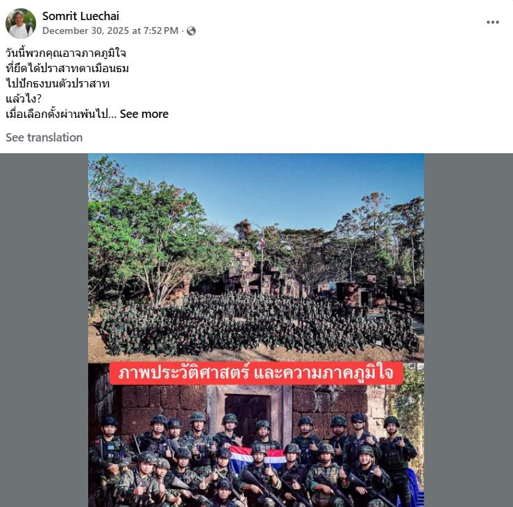យ៉ាងណាមិញមិនមែនគ្រប់ប្រជាពលរដ្ឋថៃ និងអ្នកបញ្ញវន្តថៃទាំងអស់សុទ្ធតែមិនមានការត្រិះរិះពិចារណា ឬស្ដាប់តែលើការបំប៉ោងព័ត៌មានពីជ័យជំនះរបស់កងទ័ពថៃ ដែលបានកំពុងតែបំពានឈ្លានពានលើកម្ពុជានោះឡើយ ក្នុងនោះឃើញមានសាស្ត្រាចារ្យថៃមួយរូប ដែលជាបុគ្គលមានចំណេះដឹងនិងស្គាល់ប្រវត្តិសាស្ត្រជ្រៅជ្រះ គឺលោកសាស្ត្រាចារ្យប្រវត្តិសាស្ត្រ Samrith Leuchai (សាមរិត លឺឆ័យ) បានចេញមកពន្យល់ដល់ប្រជាពលរដ្ឋថៃ ក៏ដូចជាណែនាំដល់យោធាថៃ ចំពោះអ្វីដែលពួកគេកំពុងតែយល់ច្រឡំធំថា នោះគឺជាជ័យជំនះ។ នៅថ្ងៃទី៣០ ខែធ្នូ ឆ្នាំ២០២៥ លោកសាស្ត្រាចារ្យបញ្ចេញទស្សនៈដោយភ្ជាប់ជាមួយរូបភាពក្រុមយោធាថៃ ថតជុំគ្នាមុខប្រាង្គប្រាសាទខ្មែរយើងដោយមានដោតទង់ជាតិថៃថា៖