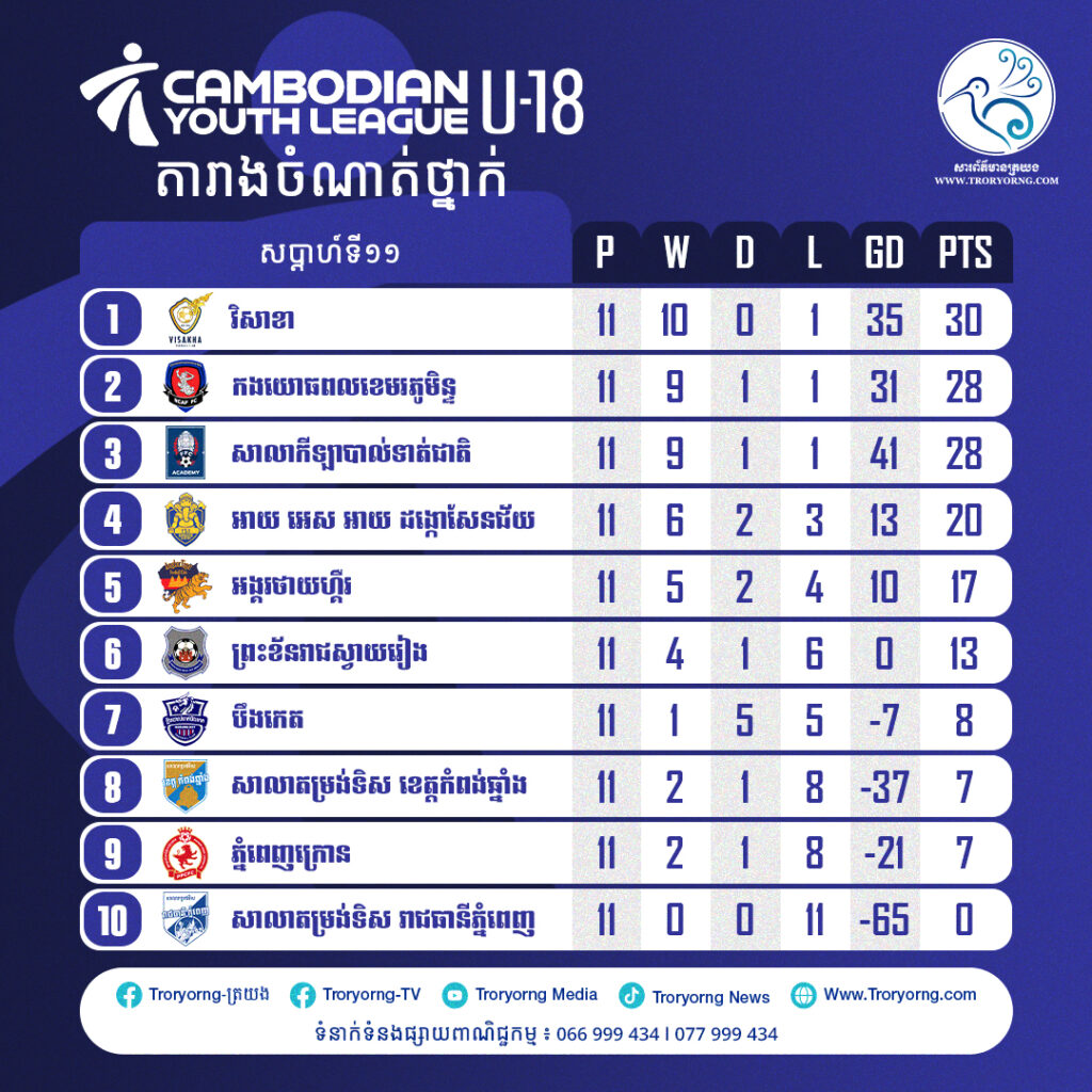 តារាងចំណាត់ថ្នាក់ Cambodian Youth League ឆ្នាំ២០២៥-២៦ ត្រឹមសប្ដាហ៍ទី១១៖