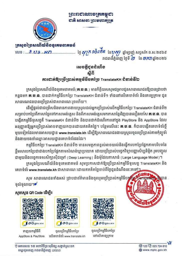 ក្រសួងប្រៃសណីយ៍និងទូរគមនាគមន៍ សូមប្រកាសដាក់ឱ្យប្រើប្រាស់កម្មវិធីទូរសព្ទ TranslateKH និងគេហទំព័រ www.translate.kh ជាសាធារណៈដោយឥតគិតថ្លៃចាប់ពីថ្ងៃជូនដំណឹងនេះតទៅ។
