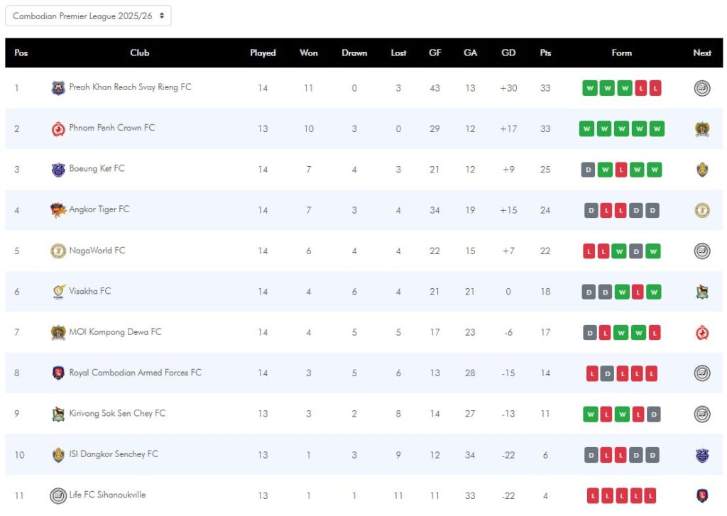 ពានរង្វាន់ លីគកំពូលកម្ពុជា Cambodian Premier League រដូវកាលថ្មី ឆ្នាំ២០២៥-២០២៦ ចាប់ផ្តើមពី ថ្ងៃសៅរ៍ ទី៩ ខែសីហា មានសមាជិកក្រុម ១១ចូលរួមប្រកួតប្រជែង រួមមាន៖ ឡាយ ខេត្តព្រះសីហនុ បឹងកេត កងយោធពលខេមរភូមិន្ទ វិសាខា ព្រះខ័នរាជស្វាយរៀង ណាហ្គាវើលដ៍ អឹម អូ អាយ កំពង់ដេវ៉ា អង្គរថាហ្កឺរ អាយអេសអាយ ដង្កោសែនជ័យ និងគិរីវង់សុខសែនជ័យ៕