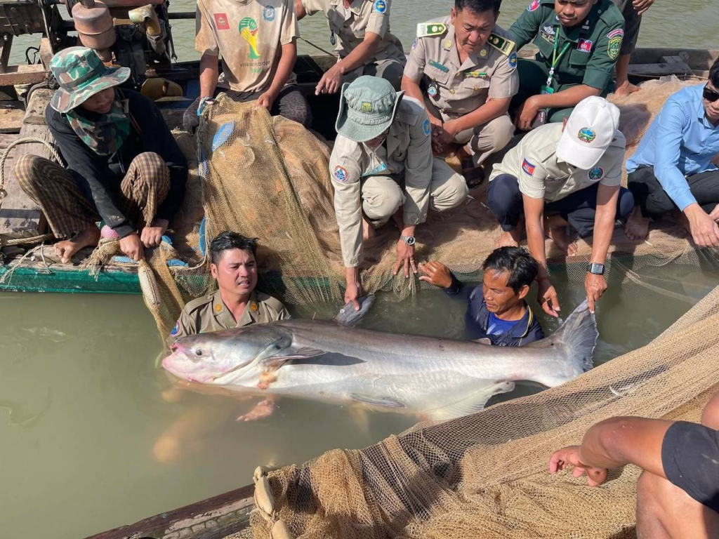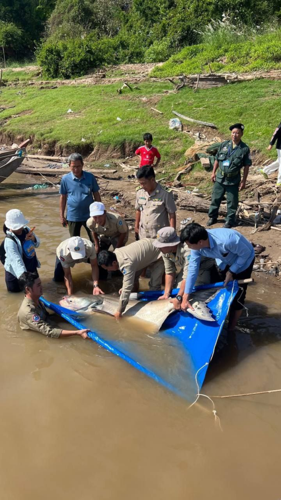 បន្ទាប់មក ឯកឧត្ដម ទឹម បូរក្ស អនុរដ្ឋលេខាធិការនៃក្រសួងកសិកម្ម រុក្ខាប្រមាញ់ និងនេសាទ ដឹកនាំក្រុមការងារបច្ចេកទេសវិទ្យាស្ថានស្រាវជ្រាវ និងអភិវឌ្ឍន៍ជលផលទឹកសាបនៃរដ្ឋបាលជលផល គម្រោងអច្ឆរិយភាពនៃទន្លេមេគង្គអធិការដ្ឋានរដ្ឋបាលជលផលមេគង្គ ខណ្ឌរ/បជលផលកំពង់ចាម សហការជាមួយអាជ្ញាធរស្រុកកងមាស អាជ្ញាធរឃុំរកាគយ និងប៉ុស្តិ៍នគរ បាលរដ្ឋបាលឃុំរកាគយ បានចុះពិនិត្យ និងកំណត់ទិន្នន័យដូចខាងក្រោមឃើញថាត្រីរាជ ភេទ ញី មានប្រវែង ១៨៦សង់ទីម៉ែត្រមានទម្ងន់សរុប ៦៣គីឡូក្រាម ពាក់ស្លាករដ្ឋបាលជលផល លេខកូដ ០៣៩ ត្រូវបានប្រជានេសាទ នេសាទបាននៅតាមដងទន្លេមេគង្គ ភូមិពង្រ ឃុំរកាគយ ស្រុកកងមាស ខេត្តកំពង់ចាម។ ក្រោយពីកំណត់អត្តសញ្ញាណដូចខាងលើរួច ក្រុមការងារ និងមន្ត្រីជំនាញជលផល បានលែងត្រីរាជនេះ ចូលក្នុងទន្លេមេគង្គវិញ ។