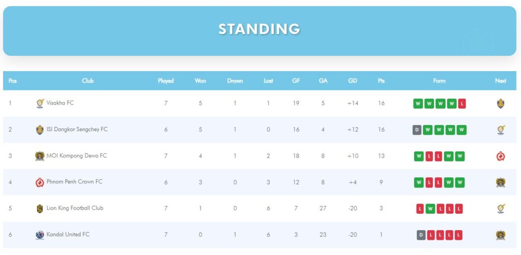វិសាខា ឆ្លងកាត់ ៧ប្រកួត ឈ្នះទាំង៥ប្រកួត ស្មើ១ ចាញ់១ មាន ១៦ពិន្ទុ តាមពីក្រោយដោយ អាយអេសអាយ ដង្កោសែនជ័យ លេងបាន ៦ប្រកួត ឈ្នះ៥ ស្មើ១ ខណ:ប្រកួតបន្ទាប់ក្រុមទាំង២ត្រូវជួបគ្នា សប្ដាហ៍ទី៨ ថ្ងៃទី១៨ មករា ២០២៦។