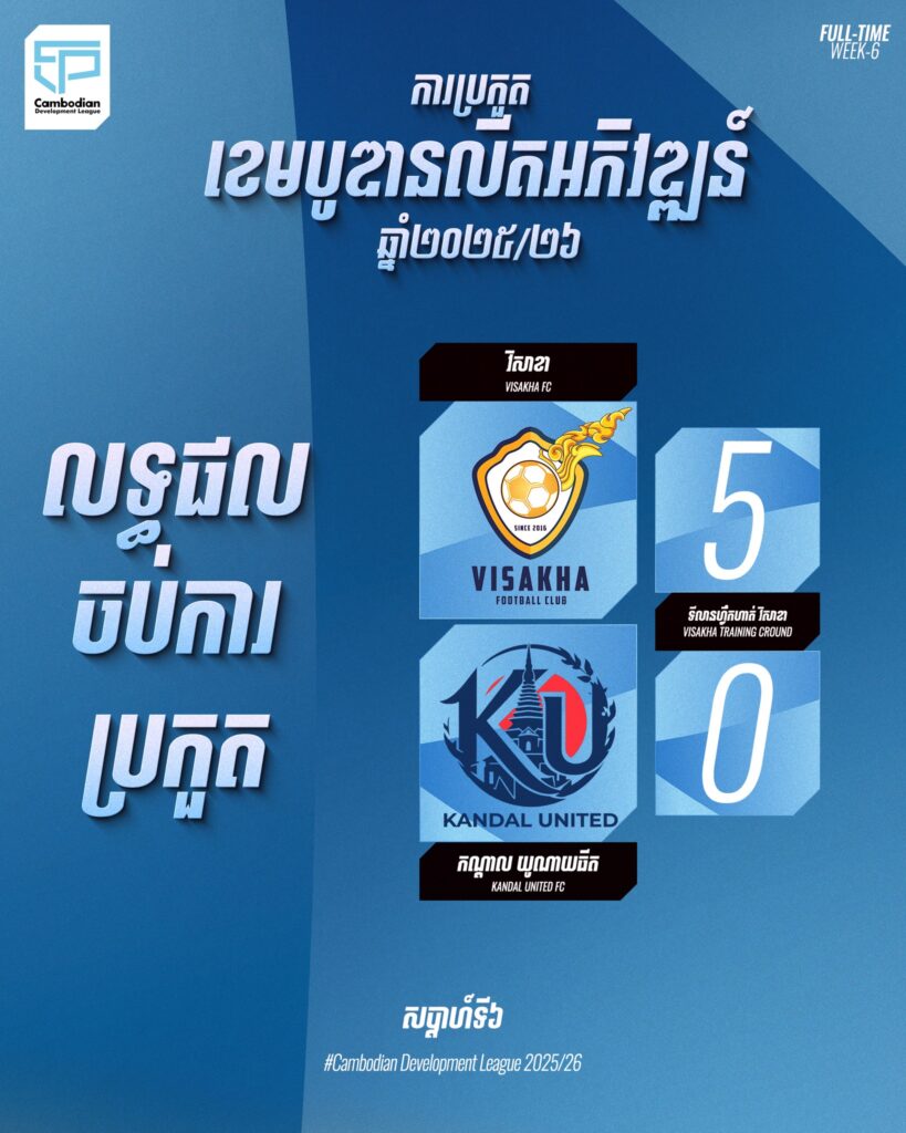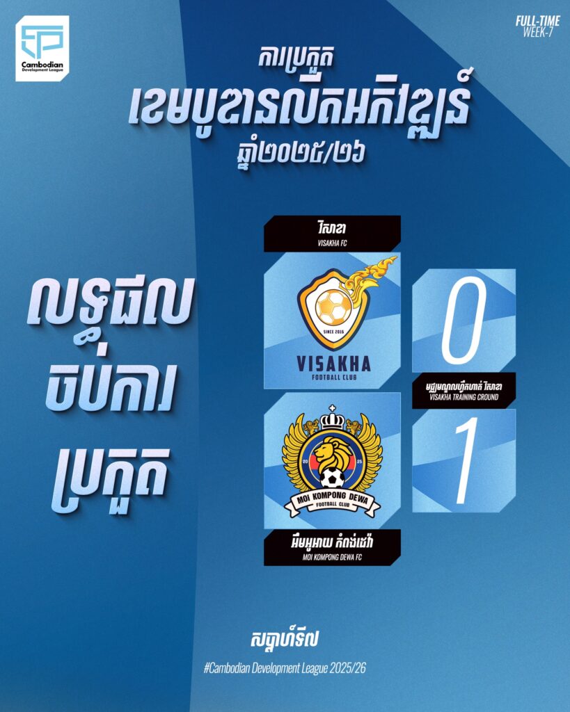 ក្លិបបាល់ទាត់វិសាខា កំពុងឈរកំពូលតារាង នៃការប្រកួតលីគអភិវឌ្ឍន៍ Cambodian Development League ឆ្នាំ២០២៥/២៦ បើទោះជាចាញ់ក្រុម MOI កំពង់ដេវ៉ា នៅសប្ដាហ៍ទី៧ កន្លងទៅ។