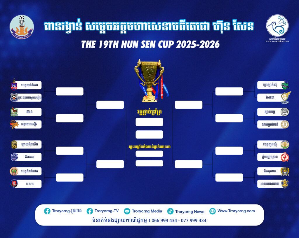 ក្រោយរកឃើញក្រុមជើងឯក និងកូតា ចេញពីការប្រកួតជើងឯកថ្នាក់ខេត្តរួច គណៈកម្មការ រៀបចំពានរង្វាន់សម្តេចអគ្គមហាសេនាបតីតេជោ ហ៊ុន សែន (Hun Sen Cup) លើកទី១៩ ជើងឯកថ្នាក់ជាតិ ឆ្នាំ២០២៥/២៦ បានចាប់ឆ្នោតរួចរាល់នៅព្រឹកថ្ងៃទី៦ ធ្នូ ២០២៦នេះ សម្រាប់ក្រុមដែលនឹងត្រូវជួបគ្នា។