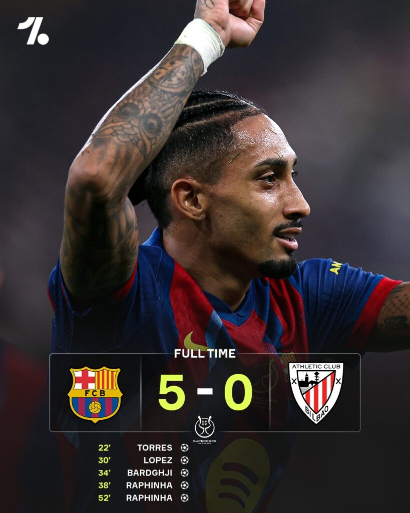 ក្រុមបាល់ទាត់ FC Barcelona បានយកឈ្នះ Athletic Club ក្នុងលទ្ធផល ៥-០ កាលពីវេលាទាបភ្លឺថ្ងៃព្រហស្បតិ៍ ទី៨ ខែមករា ឆ្នាំ២០២៦ កក់កៅអីវគ្គផ្តាច់ព្រ័ត្រពានរង្វាន់ Spanish Super Cup 2026។