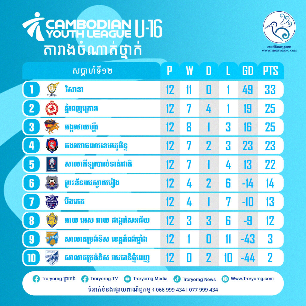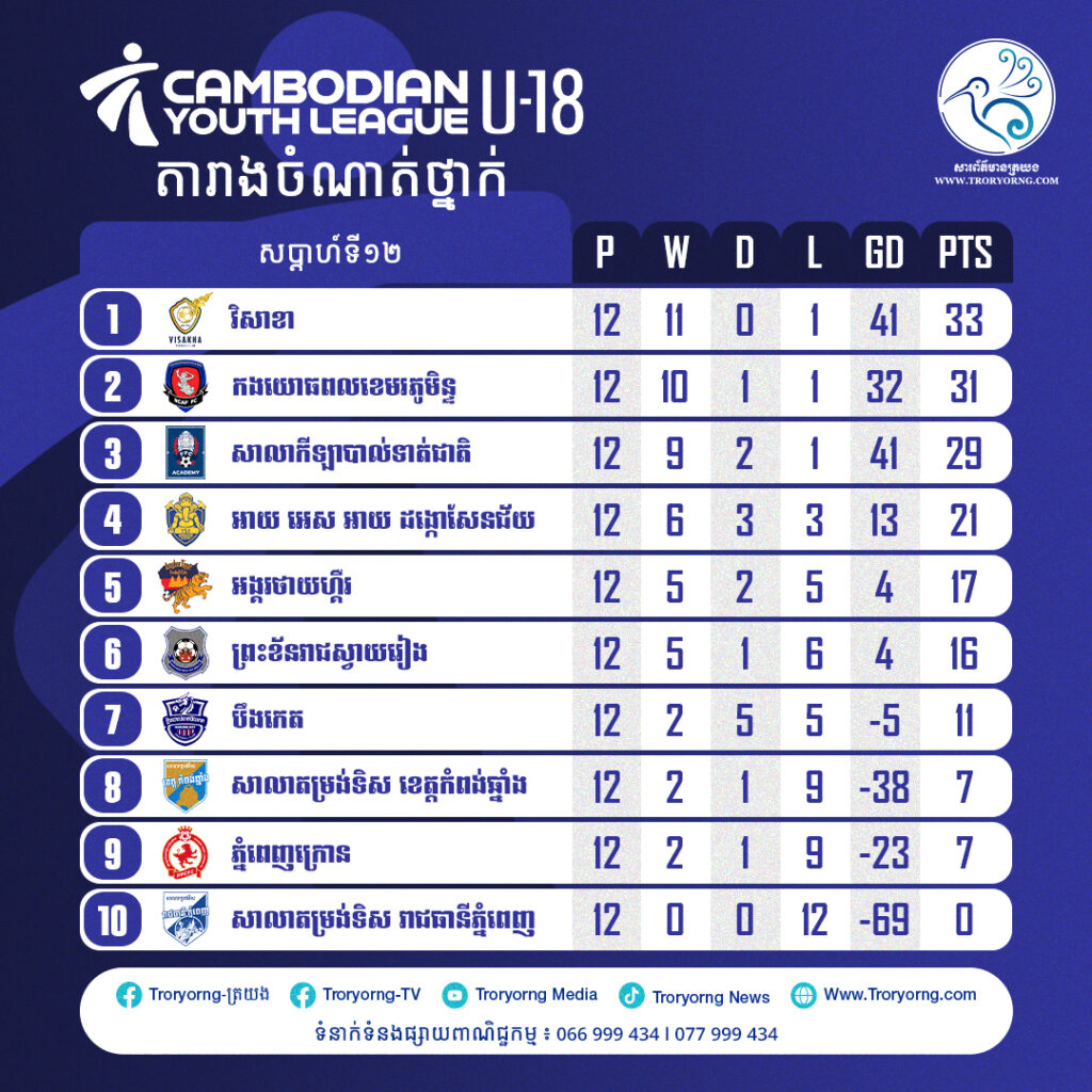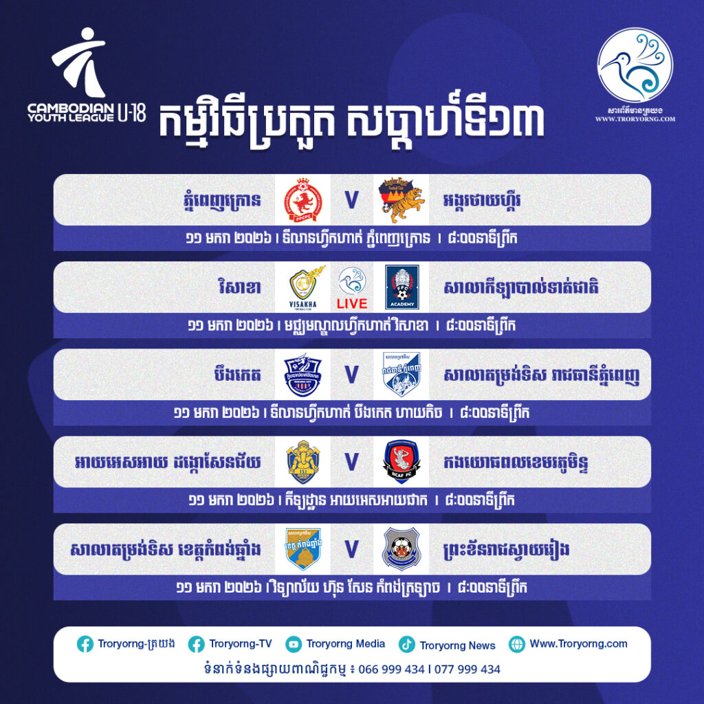 ពានរង្វាន់លីគយុវជន អាយុ១៦ និង១៨ឆ្នាំ Cambodian Youth League ឆ្នាំ២០២៥-២៦ នឹងឈានដល់ការប្រកួតជុំទី២ សប្ដាហ៍ទី១៣ហើយ នៅថ្ងៃអាទិត្យ ទី១១ ខែធ្នូ ឆ្នាំ២០២៦នេះ។