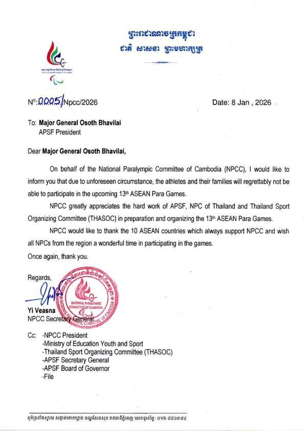 លិខិតពី NPC កម្ពុជា ចុះថ្ងៃទី៨ ខែមករា ឆ្នាំ២០២៦ ត្រូវបានផ្ញើទៅកាន់ប្រធានសហព័ន្ធកីឡាប៉ារ៉ាហ្គេមអាស៊ាន ឧត្តមសេនីយ៍ឯក អូសុទ្ធ ភាវីឡៃ និងចុះហត្ថលេខាដោយ ឯកឧត្តម យី វាសនា អគ្គលេខាធិការ NPC កម្ពុជា។ ក្នុងលិខិត បានបញ្ជាក់ថា ដោយសារតែកាលៈទេសៈដែលមិនបានមើលឃើញទុកជាមុន និងដោយមានការសោកស្តាយ អត្តពលិកកម្ពុជា នឹងមិនចូលរួមក្នុងការប្រកួតកីឡានាពេលខាងមុខនៅខេត្តនគររាជសីមា (កូរ៉ាត់) ឡើយ។