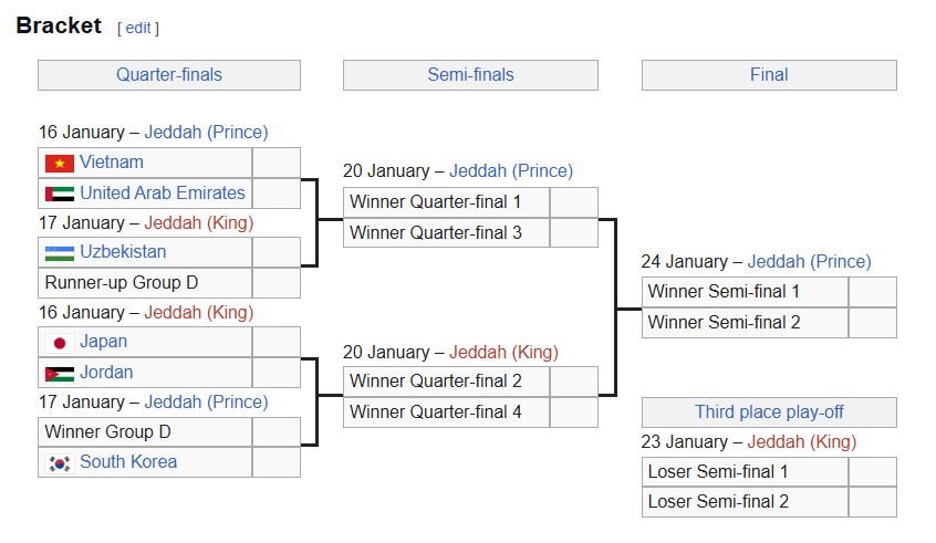 គិតត្រឹមថ្ងៃទី១៤ មករានេះ ក្រុមចំនួន ៦ហើយកក់កៅអីវគ្គ ៨ក្រុមចុងក្រោយរួមមាន៖ វៀតណាម អេមីរ៉ាតអារ៉ាប់រួម អ៊ូសបេគីស្ថាន ជប៉ុន ហ្ស៊កដានី កូរ៉េខាងត្បូង ខណ:នៅសល់២ក្រុមទៀត រង់ចាំការប្រកួតនៅថ្ងៃនេះ រវាង អ៊ីរ៉ាក់ ប្រកួតជាមួយ អូស្រ្តាលី និងថៃ ប្រកួតជាមួយចិន ស្របពេឡភារយឡើងវគ្គច្រើន មាន ចិន អូស្រ្តាលី និង អ៊ីរ៉ាក់។