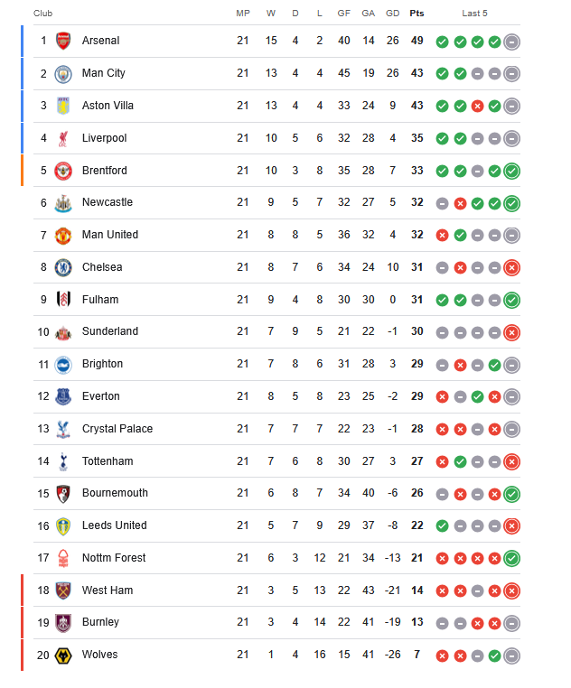 តារាងចំណាត់ថ្នាក់ Premier League ក្រោយបញ្ចប់សប្តាហ៍ទី២១៖