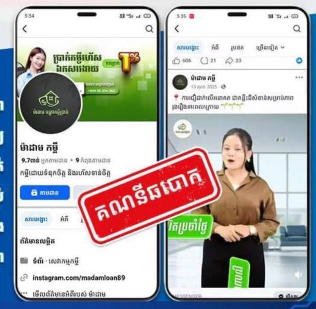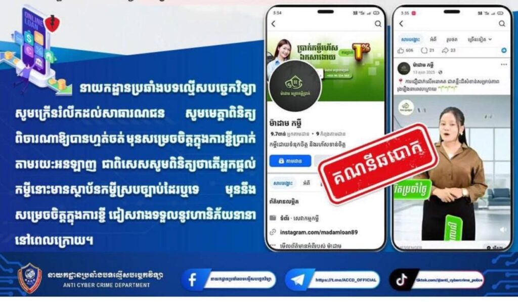 ការប្រកាសរបស់នាយកដ្ឋានប្រឆាំងបទល្មើសបច្ចេកវិទ្យនេះ ធ្វើឡើងនៅថ្ងៃទី១៤ ខែមករា ឆ្នាំ២០២៦ បន្ទាប់ពីថ្មីៗនេះ នាយកដ្ឋានប្រឆាំងបទល្មើសបច្ចេកវិទ្យា បានពិនិត្យឃើញមានការបង្ហោះផ្សព្វផ្សាយពាក់ព័ន្ធ និងការឆបោកកម្ចីអនទ្បាញ ក្រោមទំព័រហ្វេសប៊ុកឈ្មោះ “ម៉ាដាម កម្ចី” បានបង្ហោះផ្សព្វផ្សាយផ្តល់ប្រាក់កម្ចីអនឡាញ៕