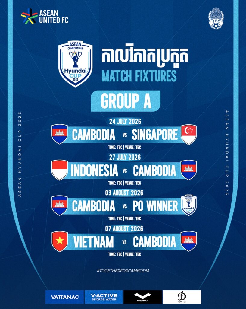 ព្រឹត្តិកាណ៍ប្រកួតបាល់ទាត់បុរសជើងឯកអាស៊ាន ដែលប្ដូរឈ្មោះថ្មីតាមម្ចាស់ឧបត្ថម្ភ ASEAN Hyundai Cup ឆ្នាំ២០២៦ នឹងចាប់ផ្ដើមពីថ្ងៃទី២៤ ខែកក្កដា រហូតដល់ថ្ងៃទី២៦ ខែសីហា ឆ្នាំ២០២៦ ពោលគឺចំពេលដែលលីគនៃប្រទេសក្នុងតំបន់អាស៊ានទាំង១១ សម្រាកតែម្ដង។