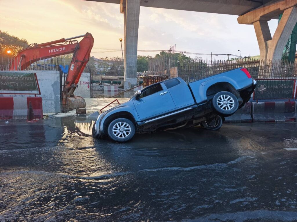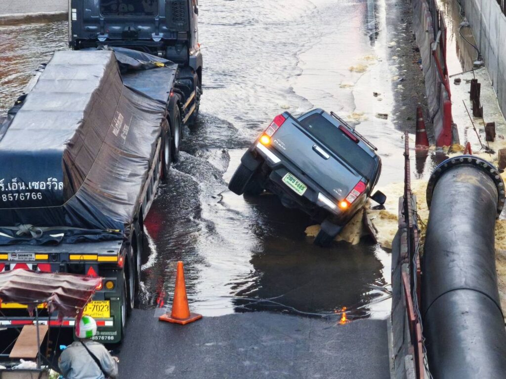 ប៉ូលិសថៃបានពិនិត្យជាក់ស្តែងបានរកឃើញថា ការស្រុតដីនេះបានធ្វើឱ្យបំពង់ទឹកស្អាតខ្នាតធំ ដែលជាបំពង់មេ រងការខូចខាត បណ្តាលឱ្យទឹកហូរហៀរជន់លិចលើផ្ទៃផ្លូវ។ ភ្លាមៗនោះ មន្ត្រីរដ្ឋាករទឹកបានប្រញាប់ប្រញាល់ធ្វើការបិទទឹក និងដោះស្រាយស្ថានការណ៍។