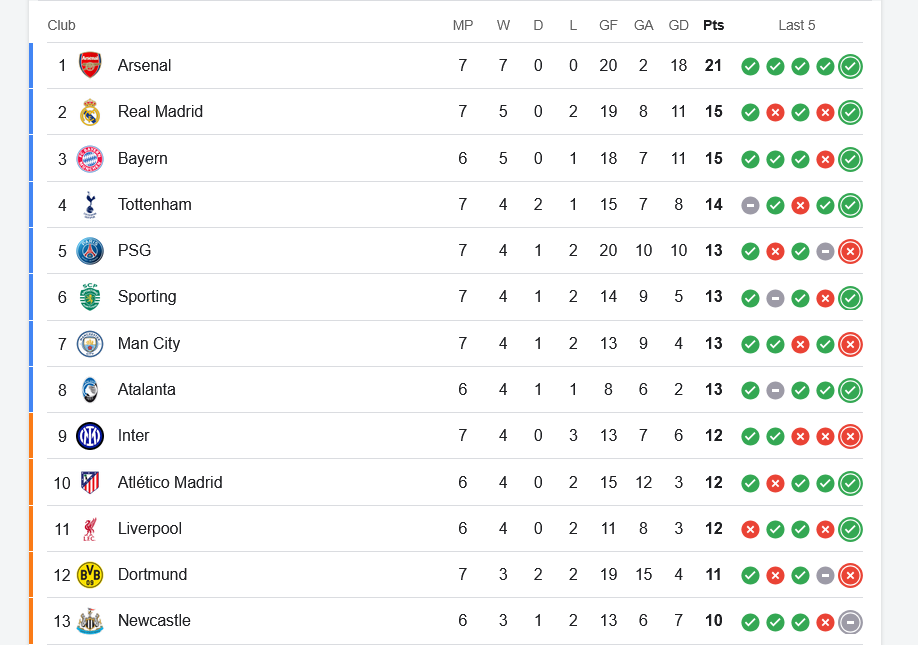 ពានរង្វាន់លំដាប់ទី១ ប្រចាំទ្វីបអឺរ៉ុប UEFA Champions League រដូវកាល ២០២៥-២៦ វគ្គសន្សំពិន្ទុបានបញ្ចប់ការប្រកួតទី៧ ស្របពេលក្រុមបាល់ទាត់ Arsenal កក់កៅអីវគ្គ១៦ក្រុមចុងក្រោយមុនគេ ក្រោយឈ្នះ៧ប្រកួតជាប់ៗគ្នា មាន២១ពិន្ទុពេញ។