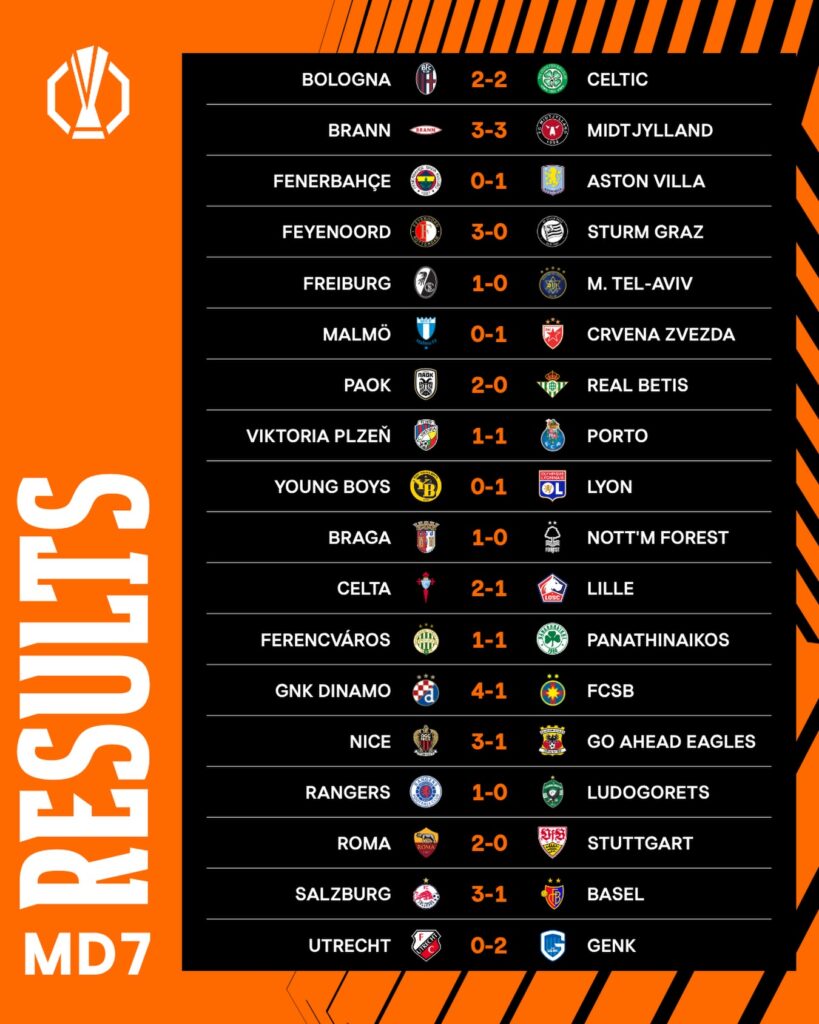 ពានរង្វាន់លំដាប់ទី២ ប្រចាំទ្វីបអឺរ៉ុប UEFA Europa League 2025–26 បានបញ្ចប់ការប្រកួតសប្តាហ៍ទី៧ហើយ ស្របពេលក្លិបបាល់ទាត់ Lyon និង Aston Villa បន្តរកបានជ័យជម្នះមានភាគរយខ្ពស់កក់កៅអីវគ្គ១៦ក្រុមចុងក្រោយមុនគេ។