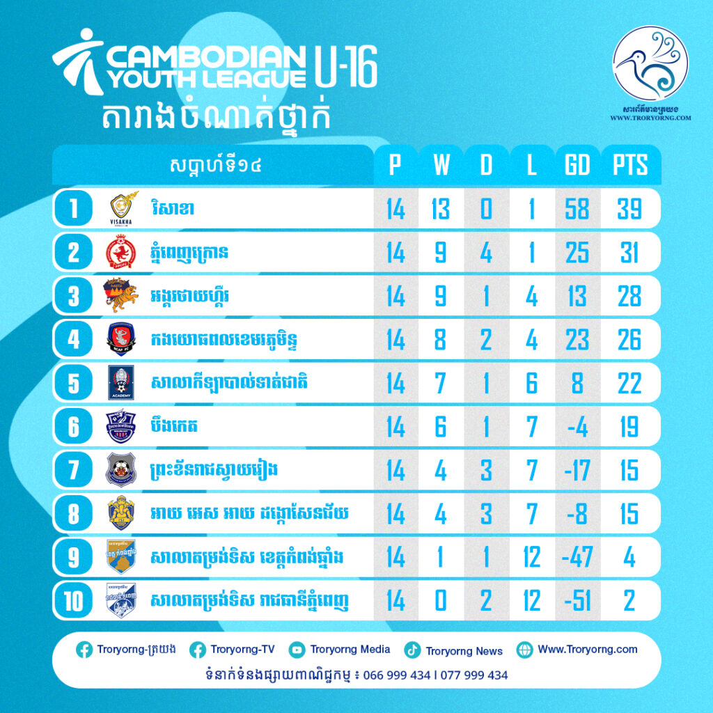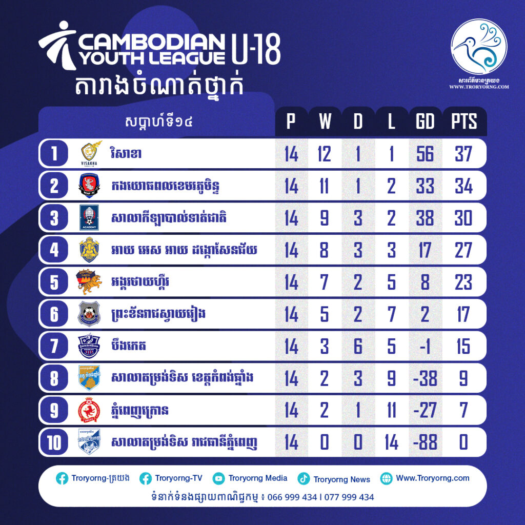 តារាងចំណាត់ថ្នាក់ Cambodian Youth League ឆ្នាំ២០២៥-២៦ ត្រឹមសប្ដាហ៍ទី១៤៖