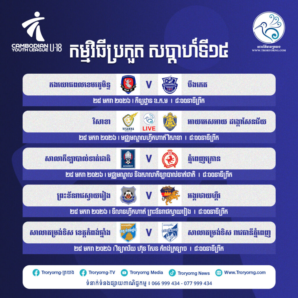 វិលត្រឡប់មកវិញ ចុងសប្ដាហ៍នេះ ពានរង្វាន់លីគយុវជន អាយុ១៦ និង១៨ឆ្នាំ Cambodian Youth League ឆ្នាំ២០២៥-២៦ នៅថ្ងៃអាទិត្យ ទី២៥ មករានេះ សារព័ត៌មានត្រយង នឹងធ្វើការផ្សាយផ្ទាល់ ការប្រកួតទាំង ២គូ ដោយយុវជន អាយុ១៨ឆ្នាំ ដំណើរការពេលព្រឹក ៨:០០នាទី និងយុវជន អាយុ១៦ឆ្នាំពេលរសៀល ម៉ោង ៣:៣០នាទី។