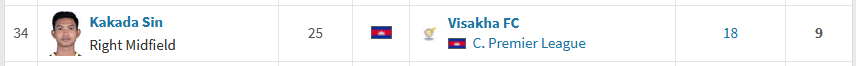 ខ្សែបម្រើរបស់ក្លិបបាល់ទាត់វិសាខា កីឡាករ ស៊ិន កក្កដា ឈរលេខ១ នៅលីគកំពូលកម្ពុជា Cambodian Premier League រដូវកាល ២០២៥-២៦ ក្នុងនាមកីឡាករ Assists ច្រើនជាងគេបណ្តោះអាសន្ន ៩លើក និងលេខ៣៤ លើពិភពលោក យោងតាមការចុះផ្សាយរបស់ Transfermarkt។